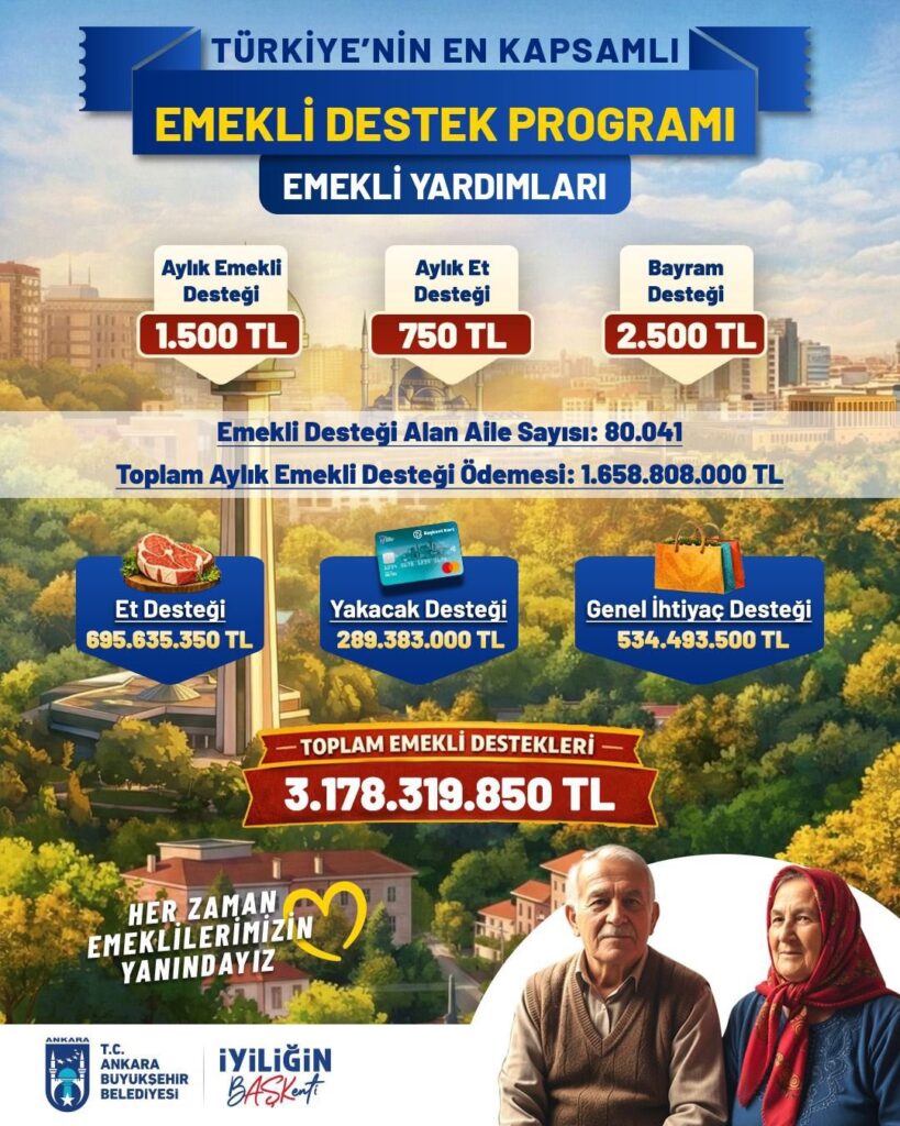 Ankara Büyükşehir Belediye Başkanı Mansur Yavaş, artan hayat pahalılığı karşısında emekli vatandaşları yalnız bırakmadı. Başkan Yavaş’ın liderliğinde yürütülen Başkent Kart destekleri kapsamında et, yakacak ve genel ihtiyaç kalemlerinde bugüne kadar 80.041 emeklinin hesabına 3.178.319.850 TL yatırıldı.